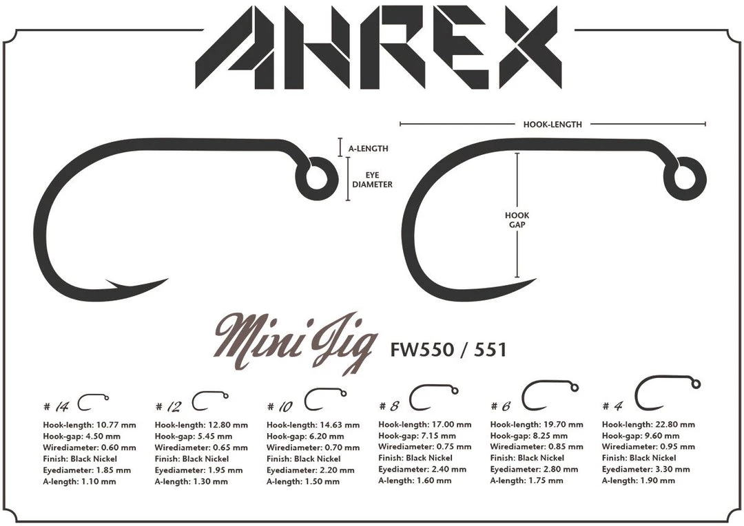 The Ahrex FW550 Mini Jig barbed hook was designed for the modern style of European nymphing – also known as “euro nymphing”.
