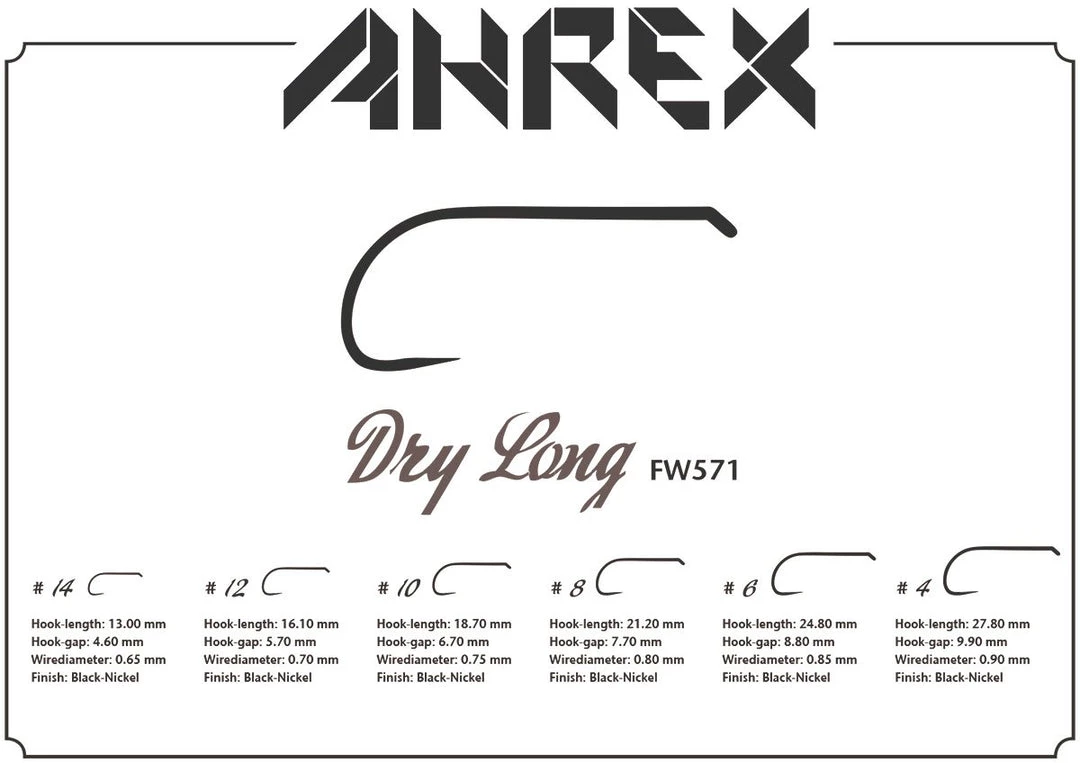 The Ahrex FW571 long dry fly barbless hook is a dry fly hook with a big hook gap – designed for large dry flies and terrestrial patterns.