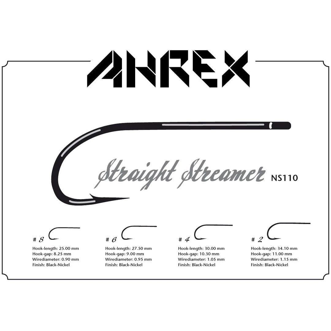 The Ahrex NS110 is a straight eye saltwater streamer hook manufactured from high-strength wire. Most classic saltwater streamer patterns will look beautiful on this hook, but it is also suited for large freshwater streamer patterns. This premium hook features a super sharp point and small barb to ensure effortless hook ups.