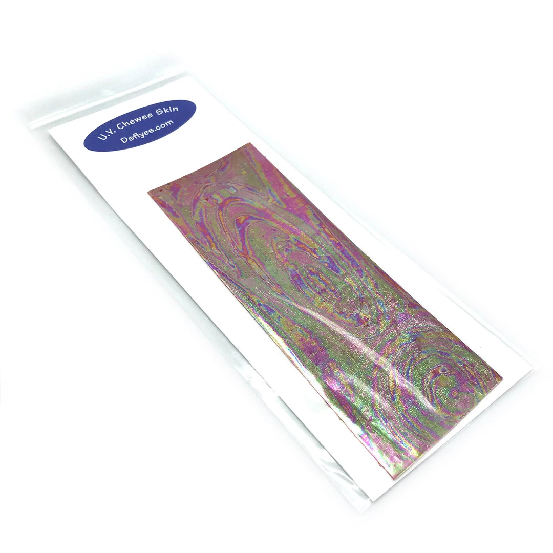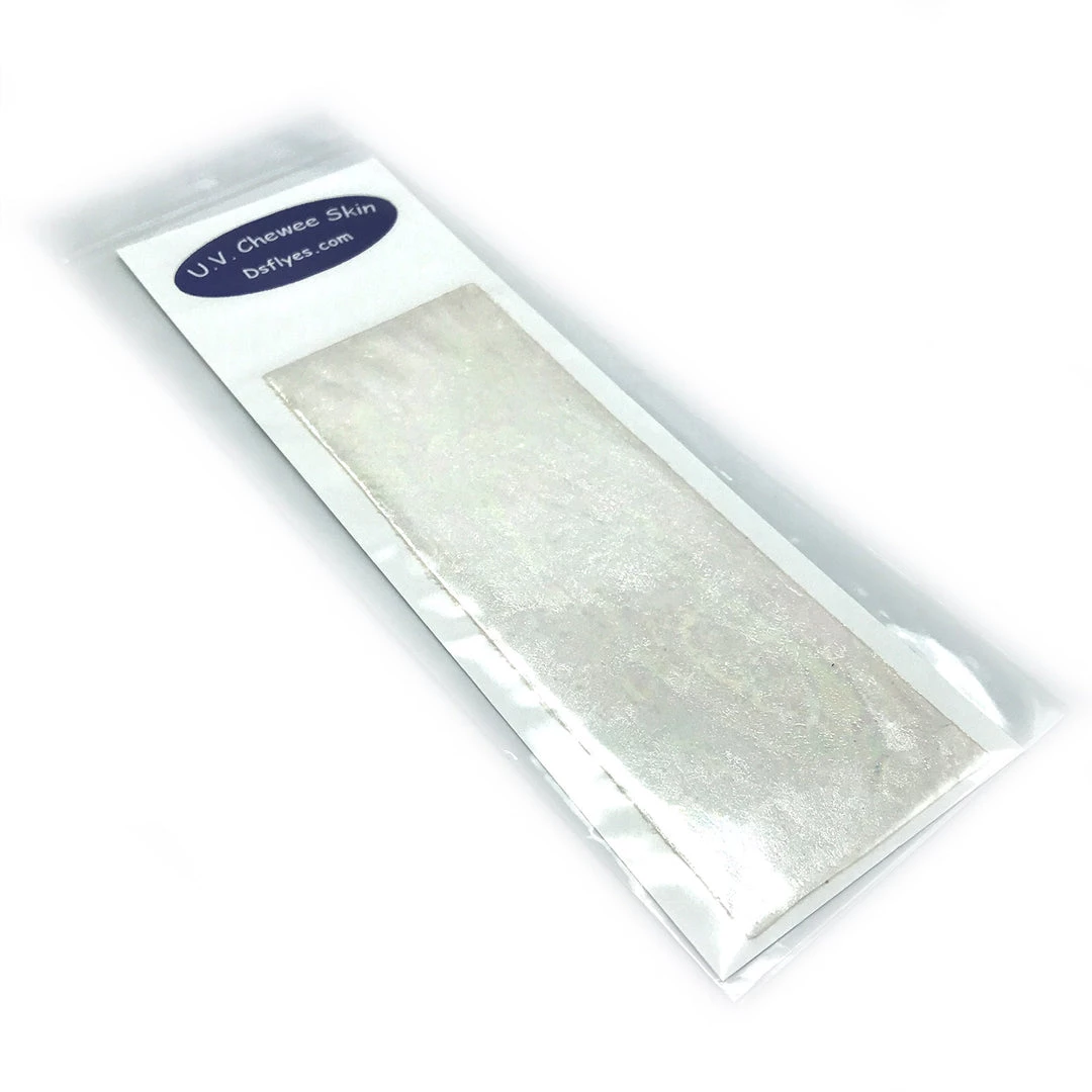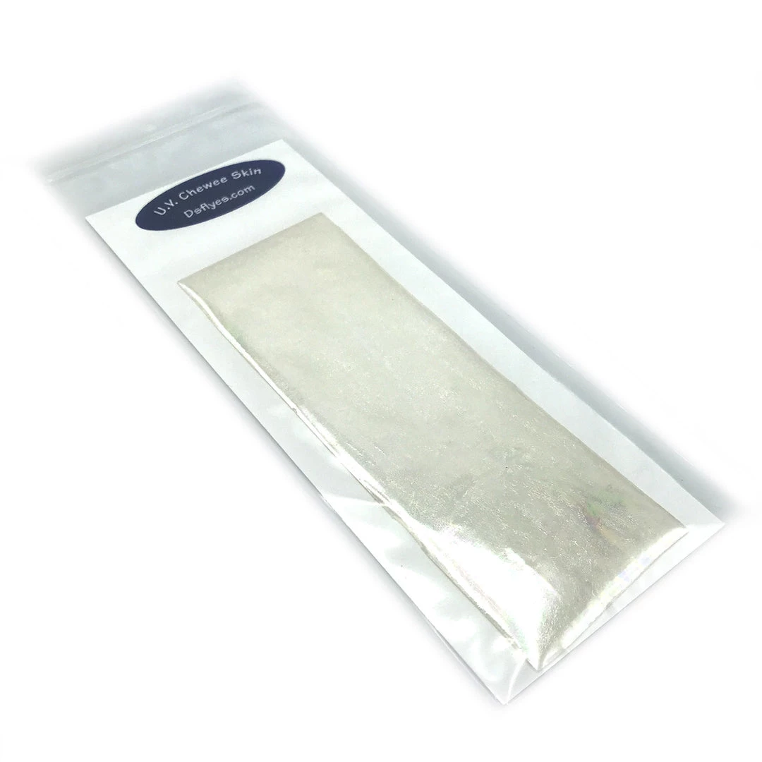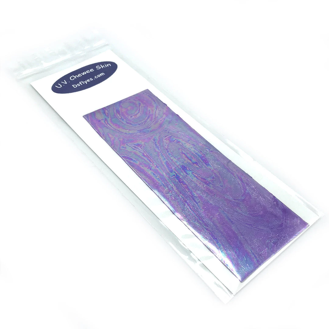 UV Chewee Skin is a pliable material that can be cut and shaped for many fly tying applications. Great for wing cases, bodies, ribs and more. This material wraps easily, has a natural sheen, and since it DOES NOT have an adhesive backing, it is extremely easy to use. The UV reflective qualities of Chewee Skin also make it more visible to trout, salmon, steelhead, and other game fish, even more so than fluorescent materials. UV Chewee skin has a multitude of uses at the fly tying bench and it’s a material that adds that little something that the fish just love. Cut it into strips, wrap it around the hook, and you have an easy and effective worm pattern. The possibilities are endless with this material, so have fun and get creative. Available in 19 fish-attracting UV colors!