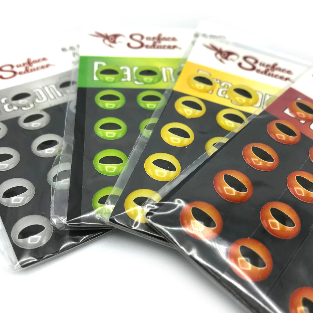 Take your fly tying to the next level with these vibrant, impressionistic 3D domed eyes. Surface Seducer Dragon Eyes are specifically designed to fit and match the full range of Surface Seducer foam products such as Double Barrel Popper Bodies. These realistic eyes imitate a variety of reptiles, amphibians, rodents, and other creatures that fish love to strike. Not only are they great on popper bodies, but they also can be used on Fish-Skull Sculpin Helmets, Fish Masks, Baitfish Heads, and any fly pattern or fishing lure that you want to add a unique look to. They feature an adhesive stick-on backing, but for a permanent solution, we recommend adding a dab of Zap A Gap to keep them secure. Surface Seducer Dragon Eyes are available in 4 fish-attracting colors and 4 sizes to suit all of your fly tying and lure making needs. 20 eyes per pack!