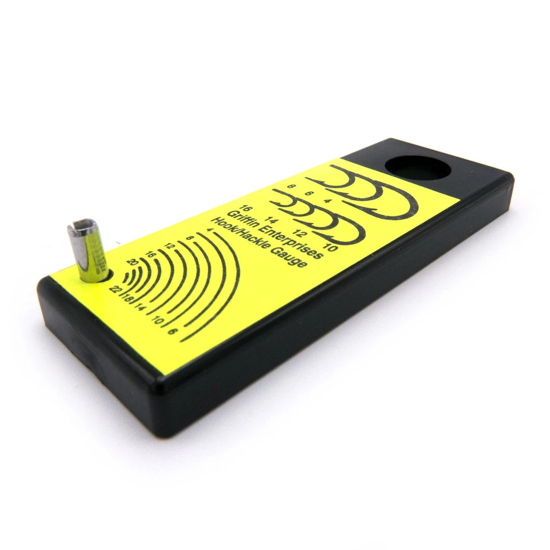 The Griffin Hook & Hackle Gauge is a convenient tool that quickly measures hook and hackle sizes. The scales are printed on a high-visibility yellow background for ease of use.