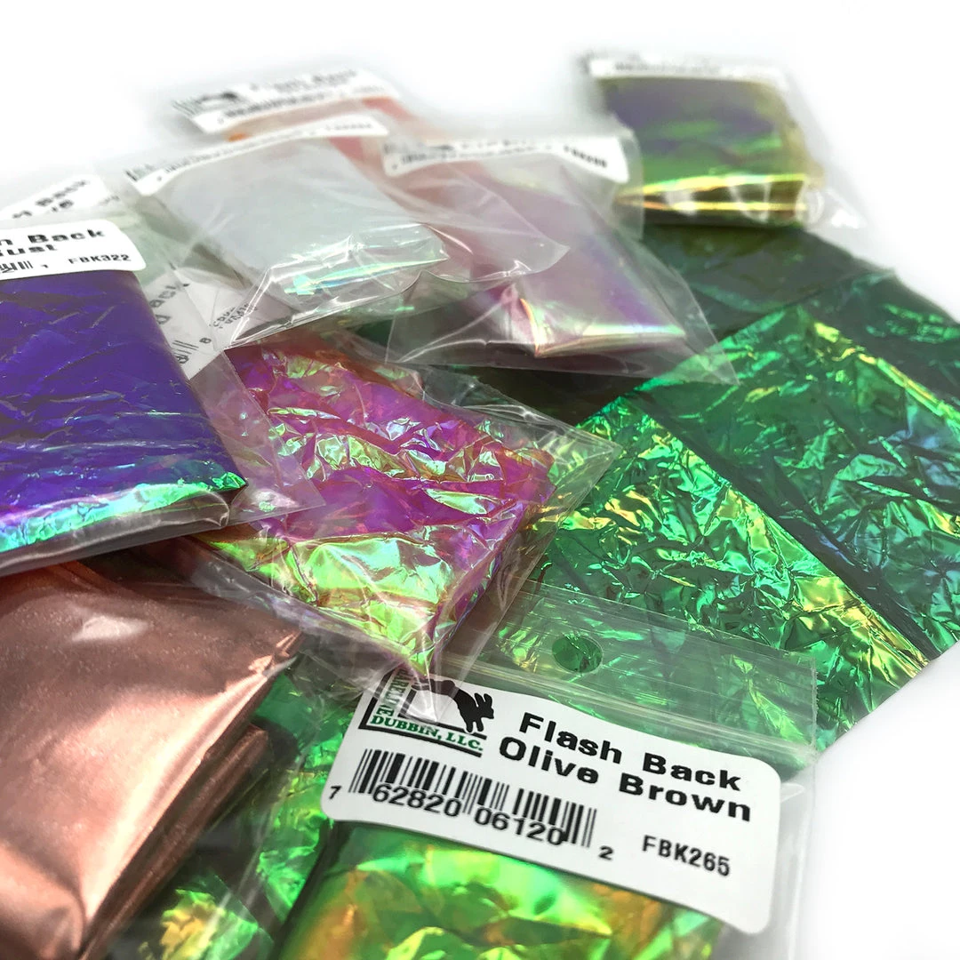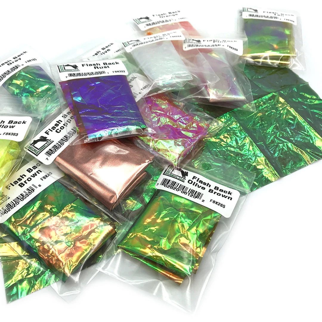 Hareline’s Flashback fly tying material is a durable, dyed pearlescent sheet that is specially made for wingcases on nymphs, scud backs, and crustacean shells on crab and shrimp patterns. Flashback has the ability to capture and reflect light and adds a lifelike sparkle to your flies. It will also change colors depending on what angle it is viewed from. If you’re looking for that extra “Pop” to get the attention of stubborn fish, Flashback is a must-have material for your flies. Available in a 14 pearlescent flashy colors!