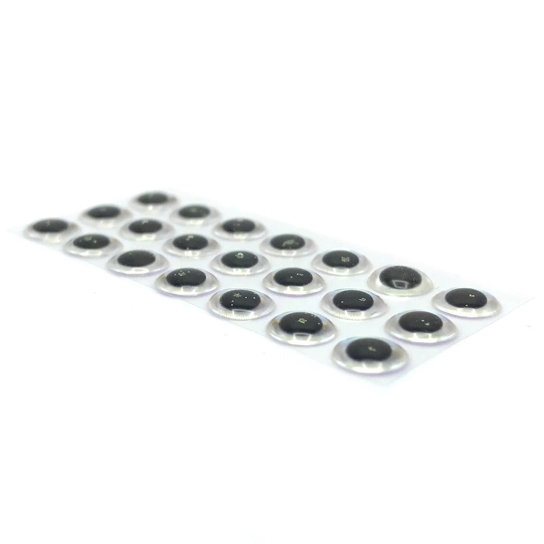 Hareline’s Mirage Dome Lure Eyes are the ultimate in fly tying and fishing lure eyes. These 3D domed stick-on eyes feature a color-shifting Mirage film as a base. The iris of the eyes will shift color tones when viewed from different angles, giving them a realistic appearance to fish in the water. Adhere them to your favorite baitfish fly patterns and fishing lures to add a lifelike appearance that fish can’t resist! Mirage dome lure eyes feature an adhesive backing, but we recommend adding a drop of Zap-A-Gap for a permanent adhesion. Available in your choice of 4 popular sizes listed below. 20 eyes per pack!