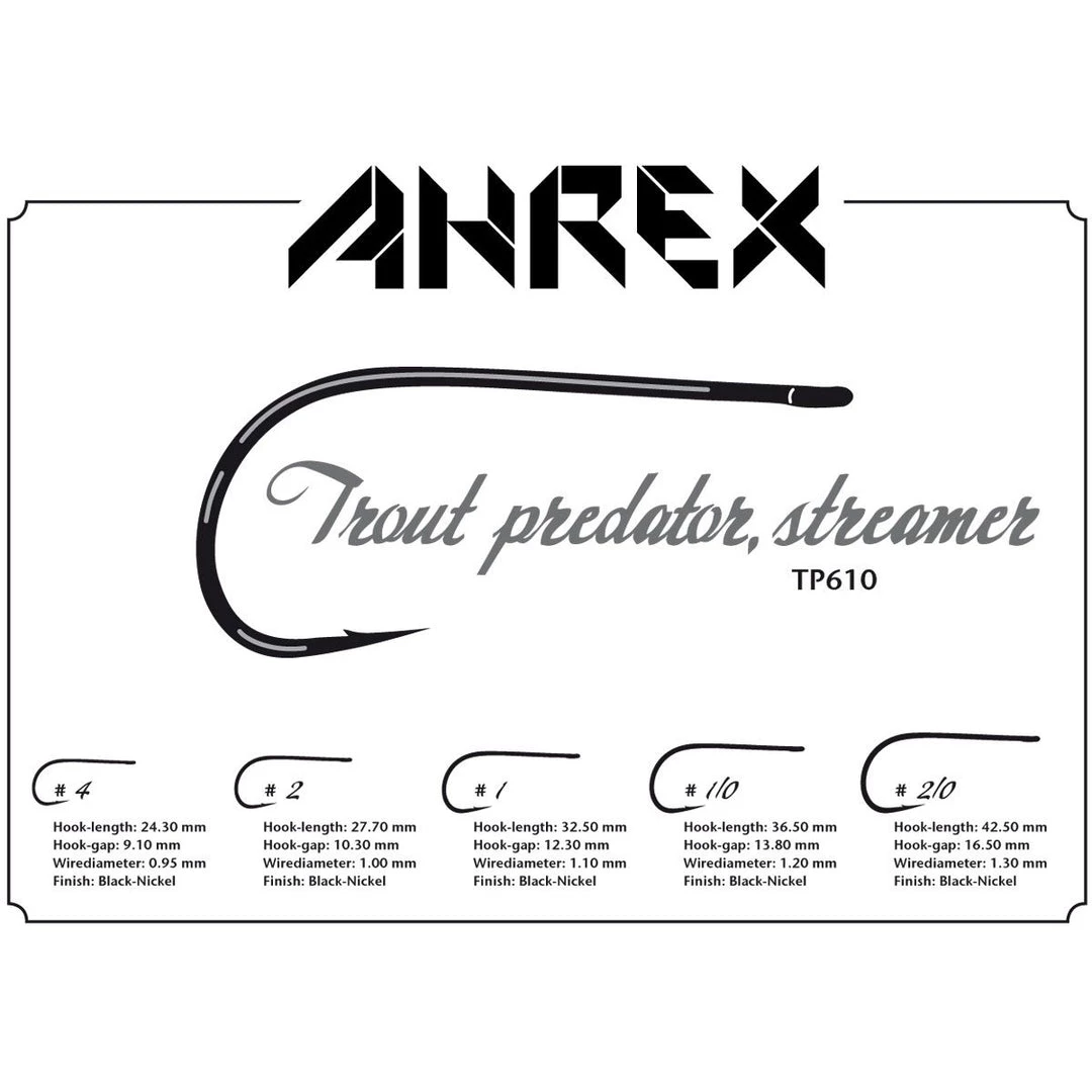 The Ahrex TP610 Trout Predator Streamer Hook is an excellent leading hook for modern articulated streamers. It features a Stinger/Aberdeen hybrid bend with strong wire. The wide hook gape aids in tracking and hook up percentage on bulky modern streamers, deer hair, and mouse patterns. Ahrex hooks are extremely sharp and made with the best materials and technology available.