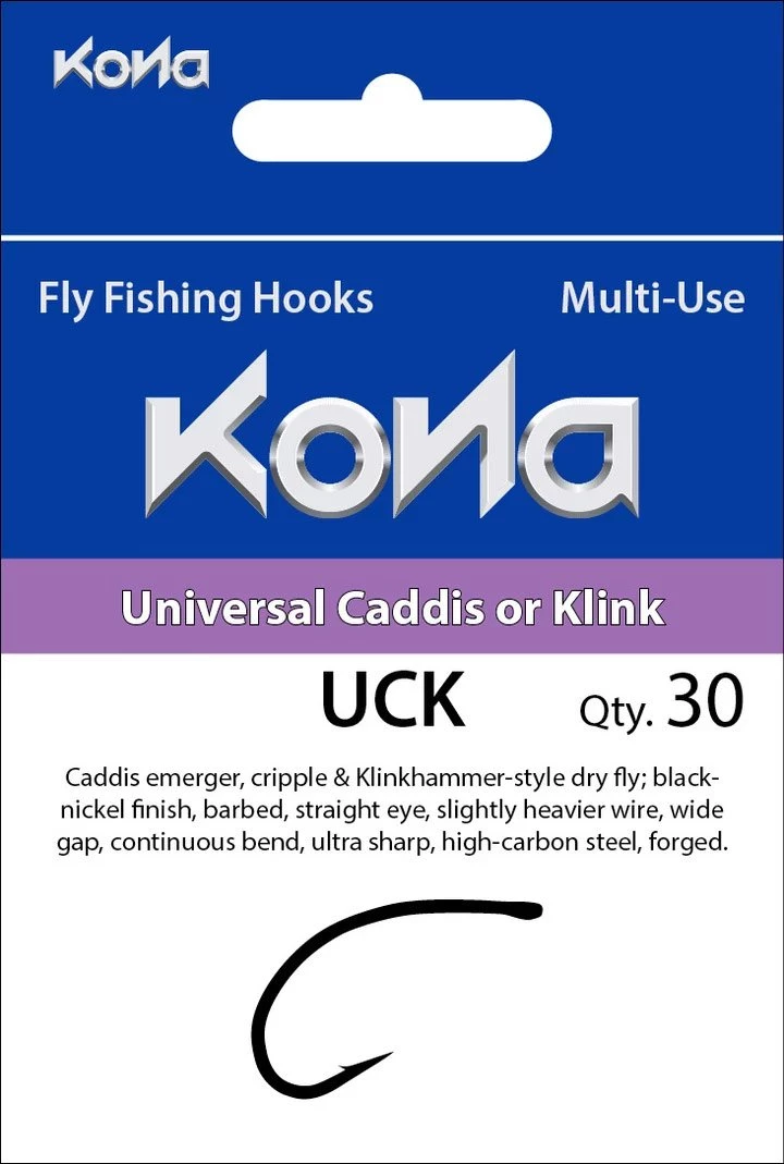 The Kona UCK hook is perfect for tying a variety of caddis emerger, cripple, and Klinkhammer-style dry flies. This versatile fly hook has a slightly heavier wire for added strength.