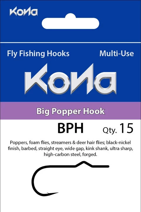 The Kona BPH hook is perfect for tying big foam flies for freshwater and saltwater as well as large streamers and deer hair flies. The kink shank reduces twisting inside the fly body and the wide hook gap optimizes hook-up rates by creating separation from the fly body.