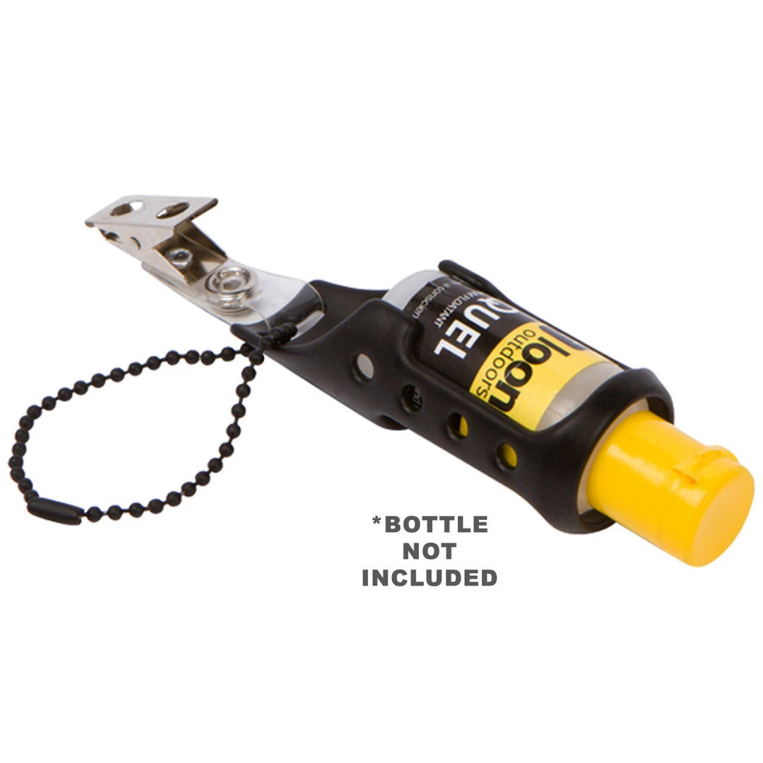 How To Use: Slide 1/2 oz Loon bottle down into caddy. Squeeze caddie to desired tightness. Attach to your vest or backpack and go fishing!