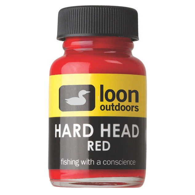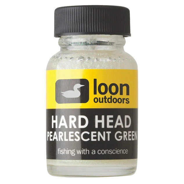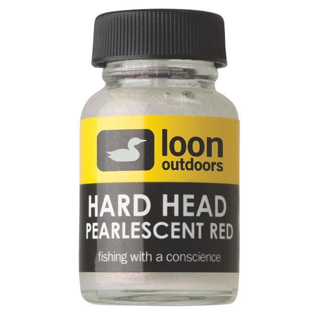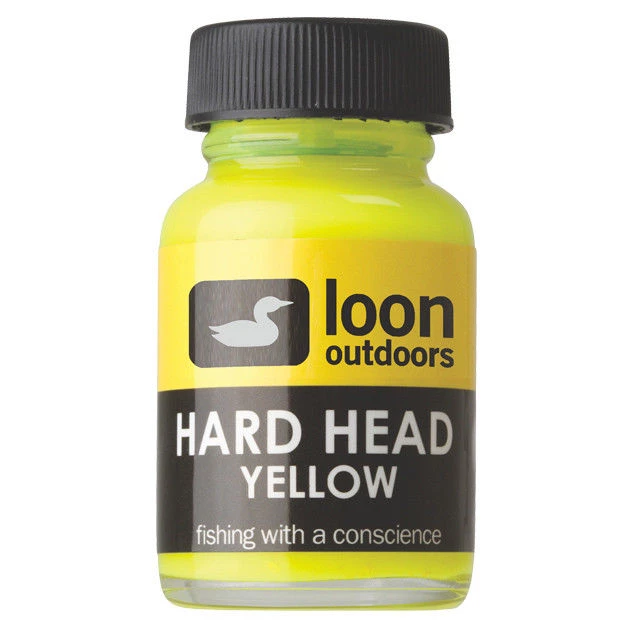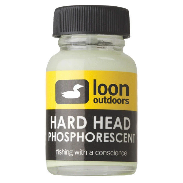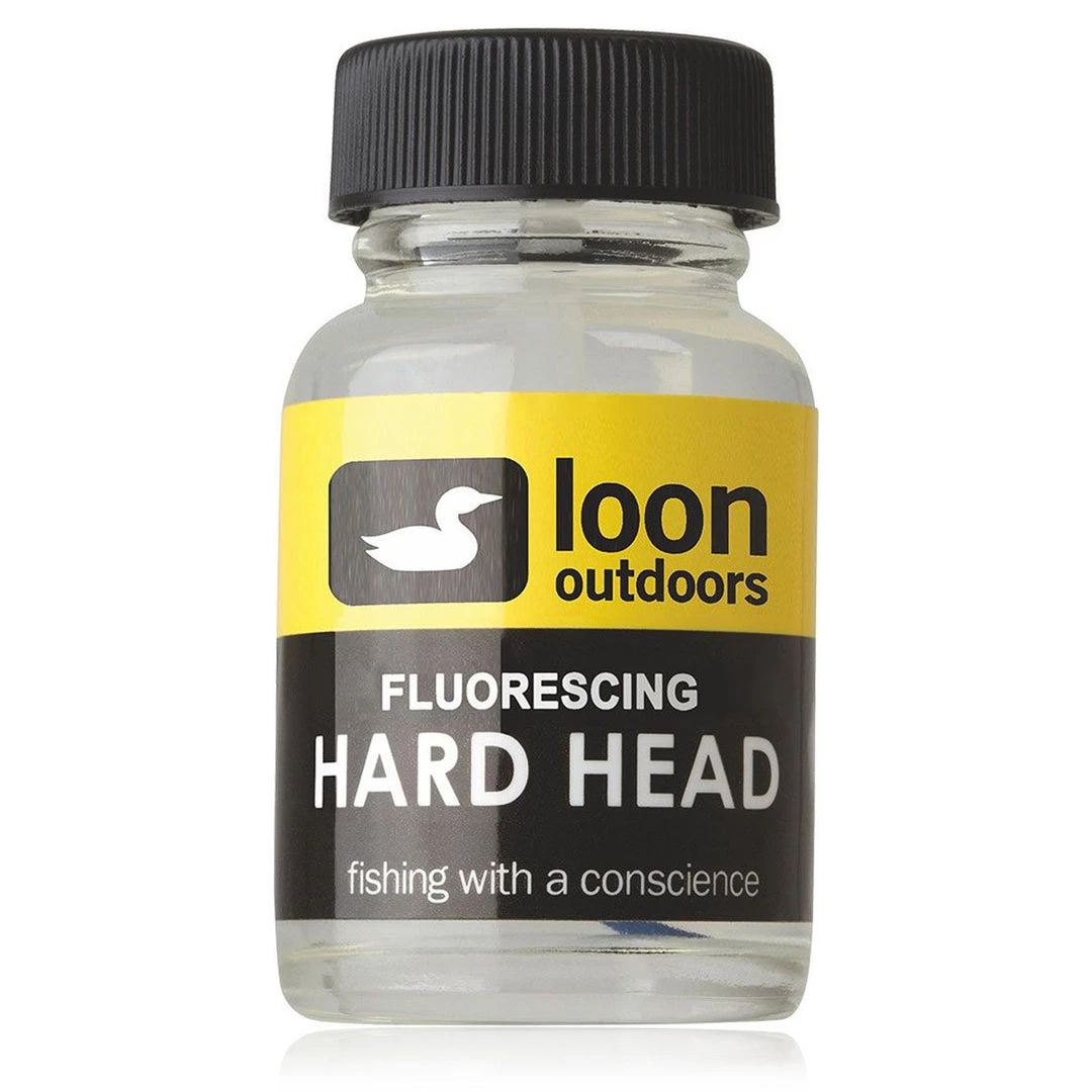 Loon Hard Head is an odorless, non-toxic, thick head cement perfect for building glossy heads and bodies. This fly tying head cement dries hard and glossy. Fluorescing Hard Head performs just like Hard Head Clear, but takes the UV light underwater and reflects it as a color more visible to fish. An extremely popular head cement.