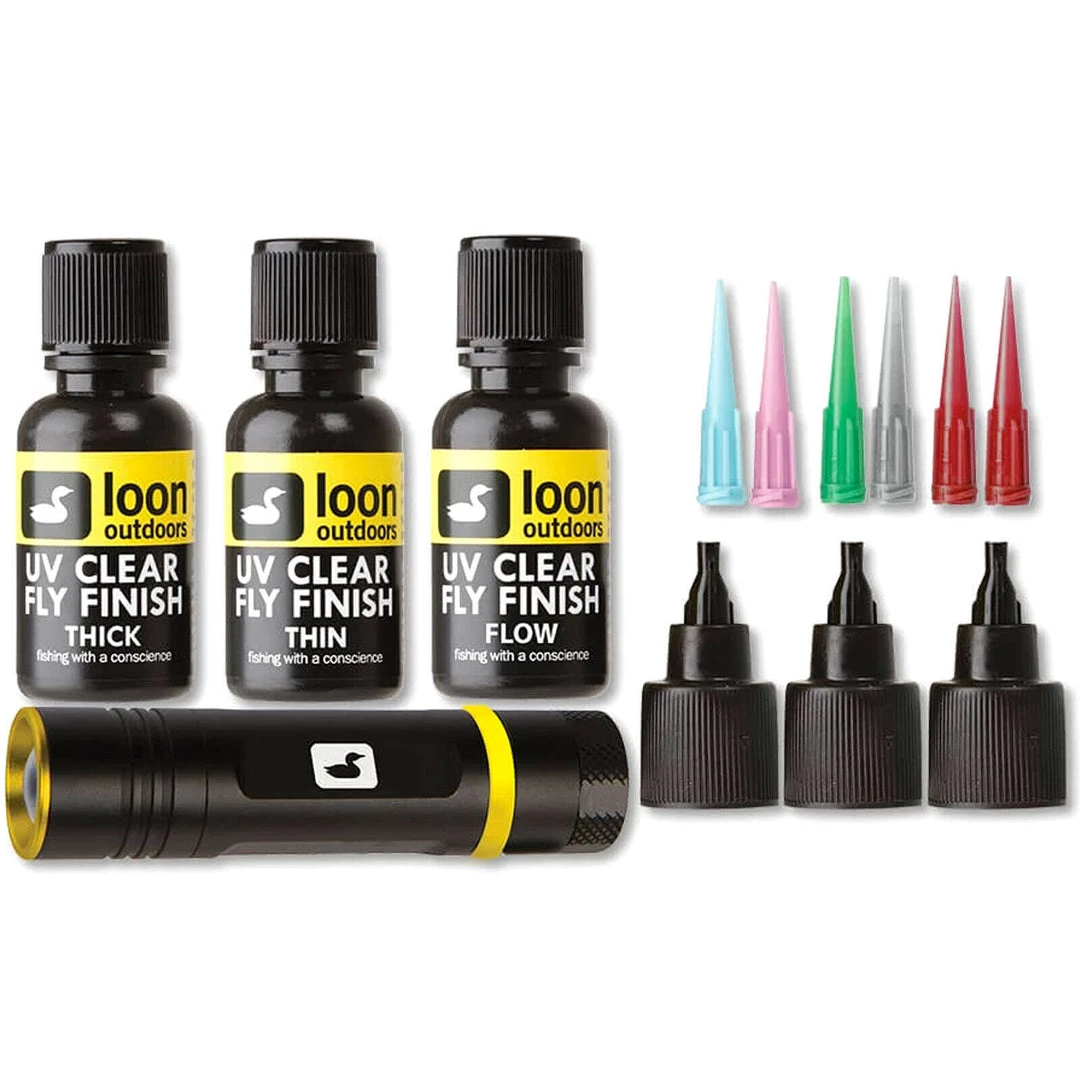 The Loon UV Fly Tying Kit includes everything a fly tyer needs to make the transition from traditional cements to UV curing resins. This 4-piece kit includes a 1/2 oz bottle of UV Clear Fly Finish Thick, Thin, & Flow, plus their popular UV Bench Light which will cure the UV resins in a matter of seconds. Build fly heads and bodies with ease, have complete control over tying your flies, and save time at the bench with the Loon UV Fly Tying Kit!
